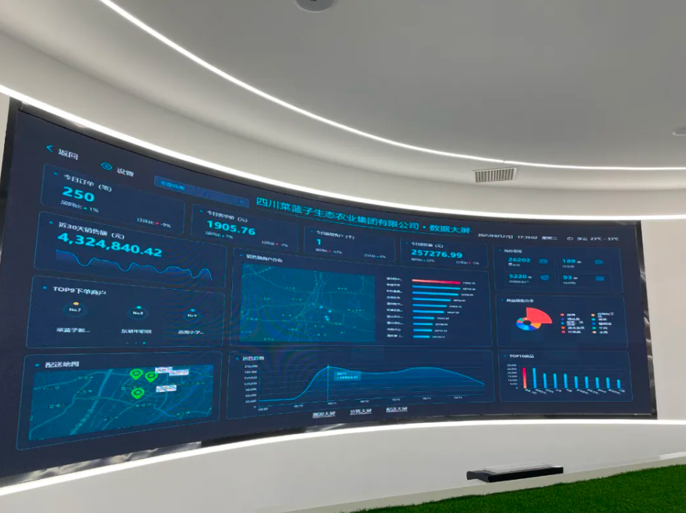 李总介绍,在四川菜蓝子总部,三大智慧数字大屏正成为业务数字化的可视化中枢,真正实现业务流程的全面数字化渗透。