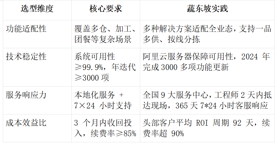 中大型企业选型需重点考察以下维度,蔬东坡的表现可作为基准参照: